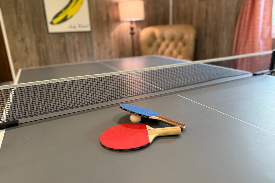 To use the shared game room, you will need to exit your unit and enter the property through the main entrance, which is located on the north side of the building in the center. Both units have access to the game room.